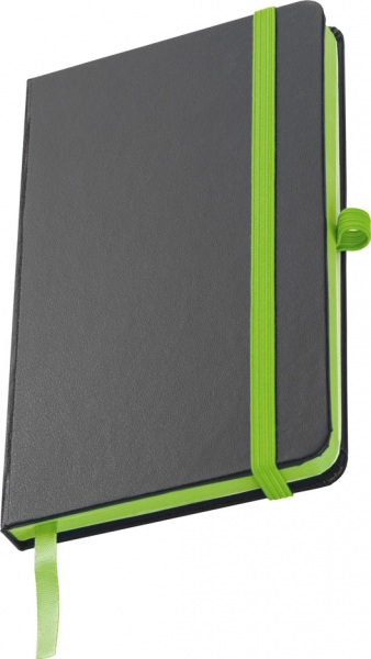 Zápisník s čiernym PU krytom a 160 linajkovanými stranami. Zápisník má farebné doplnky: elastickú gumičku na zatváranie, pútko na pero a záložku.