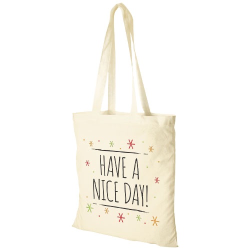 Vďaka hustote bavlny 140 g/m2 je taška pevná, má dlhú životnosť a je vhodná na prenášanie ťažkých predmetov v hlavnej priehradke. Vďaka 30 cm dlhým ušiam sa táto taška ľahko prenáša. Vyrobené v Indii a certifikované OEKO-Tex. Maximálna nosnosť t5 kg.