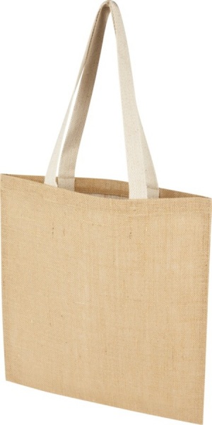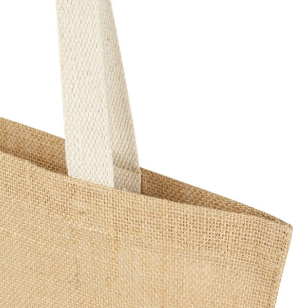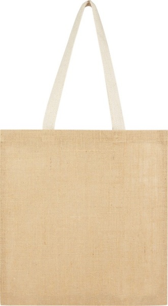 Nákupná taška s objemom 7 litrov z pevnej a odolnej 300 g/m2 laminovanej juty. Dlhé tkané bavlnené uši (30 × 2,5 cm). Vyrobené v Indii a certifikované OEKO-Tex.