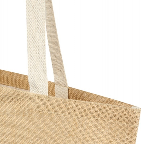 Nákupná taška s objemom 12 litrov z pevnej a odolnej 300 g/m2 laminovanej juty. Dlhé tkané bavlnené uši (30 × 2,5 cm). Vyrobené v Indii a certifikované OEKO-Tex.