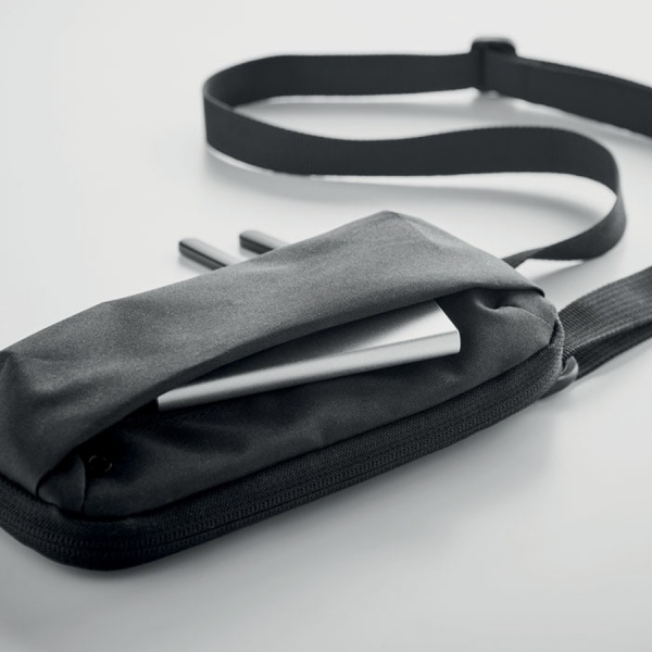 Obal na smartphone z polyesteru 300D RPET s nastaviteľným popruhom cez telo. Predné a bočné vrecko na zips. Hlavný priestor má niekoľko vreciek.