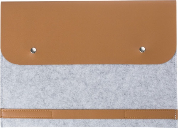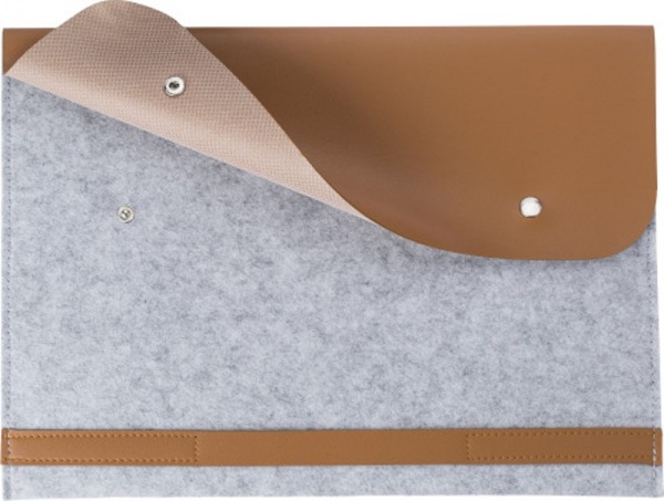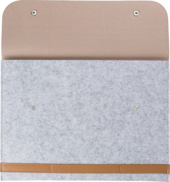 RPET plstené vrecko na notebook (14 palcov) s PU detailmi. Zatvára sa na dva gombíky.