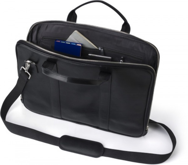 Kožená taška na notebook (15 palcov) so zipsom. Taška má viacero vnútorných priehradiek: 4 vrecká, jednu priehradku na zips a jednu priehradku na notebook so suchým zipsom. Má dve krátke kožené rúčky a jeden nylonový nastaviteľný ramenný popruh.