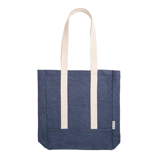 Neformálna kabelka z džínsoviny (300 g/m2). Obsahuje 1 vnútorné vrecko na zips, zosilnené švy a 64 cm dlhé bavlnené rúčky.