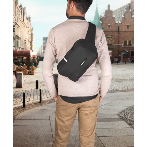 Batoh s jedným popruhom z 300D rPET a 600D rPET. Má hlavný priestor a predné vrecko na zips. Obsahuje reflexné prvky a vnútornú gumičku na nosenie fľaše. Popruhy a chrbát sú polstrované