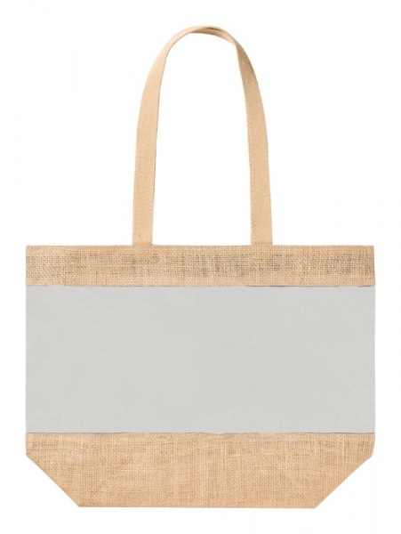 Farebná plážová taška v kombinácii laminovanej juty a laminovanej bavlny s dlhými rúčkami.