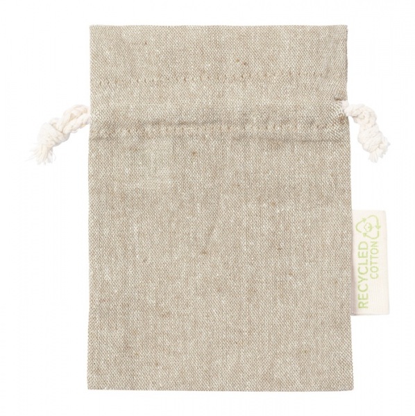 Darčekové vrecúško z recyklovanej bavlny so sťahovaním na šnúrku. S výrazným štítkom. 100% recyklovaná bavlna, 120 g/m2.