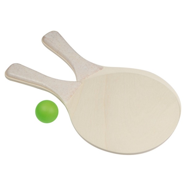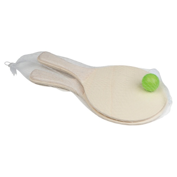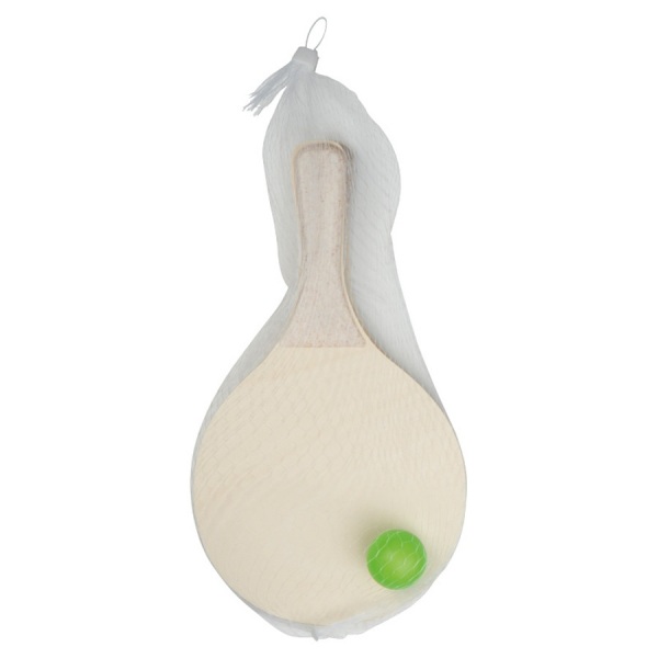 Plážový set balený v sieťke. Set obsahuje dve drevené pálky s plastovými rúčkami a loptičku.