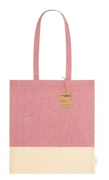 Dvojfarebná nákupná taška z recyklovanej bavlny s dlhými ušami a výrazným štítkom z recyklovanej bavlny. 100% recyklovaná bavlna, 120 g/m2.