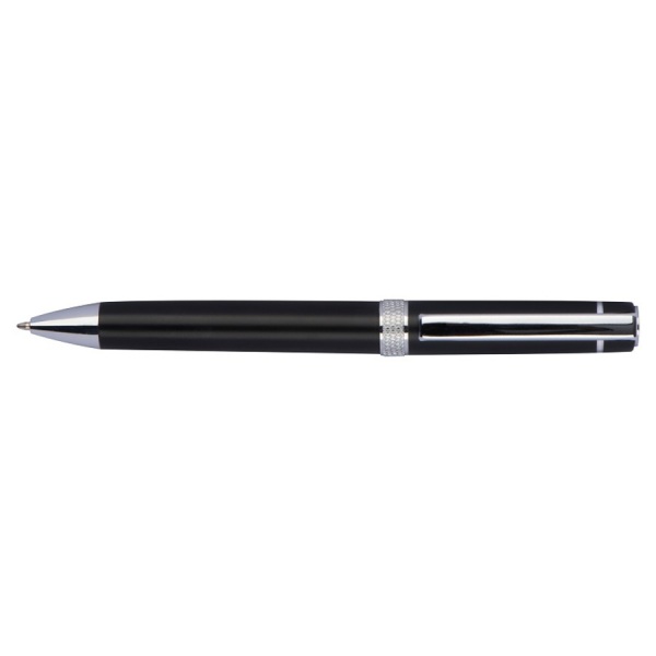 Twist kovové guľôčkové pero s vrúbkovaným ozdobným krúžkom a modrou náplňou na písanie.