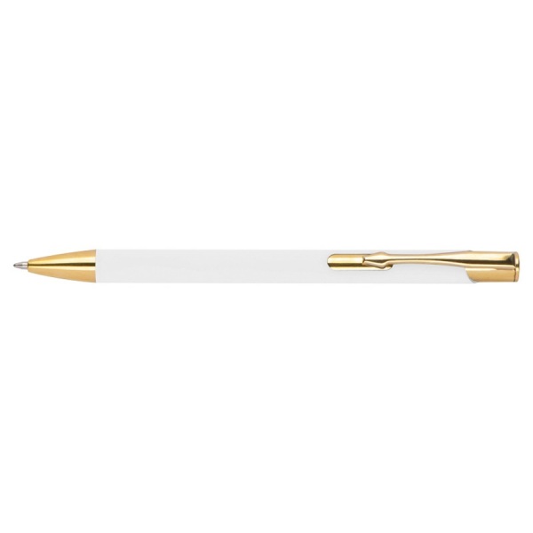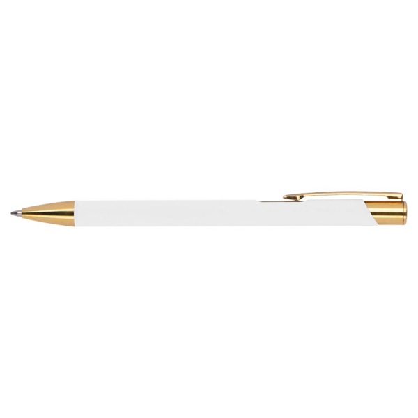 Guľôčkové pero z hliníka so zlatými aplikáciami, gumenou povrchovou úpravou a modrou veľkokapacitnou náplňou.