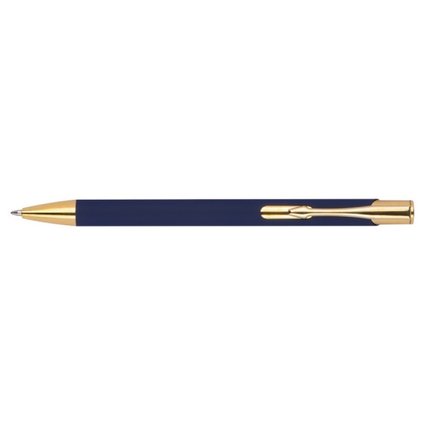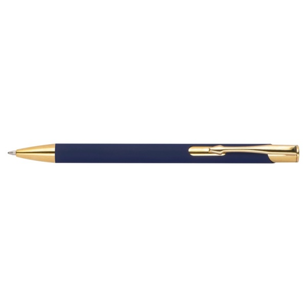 Guľôčkové pero z hliníka so zlatými aplikáciami, gumenou povrchovou úpravou a modrou veľkokapacitnou náplňou.
