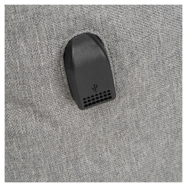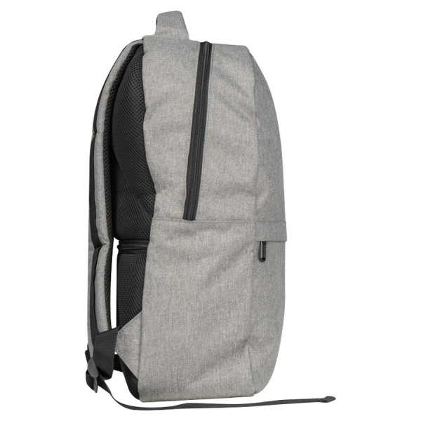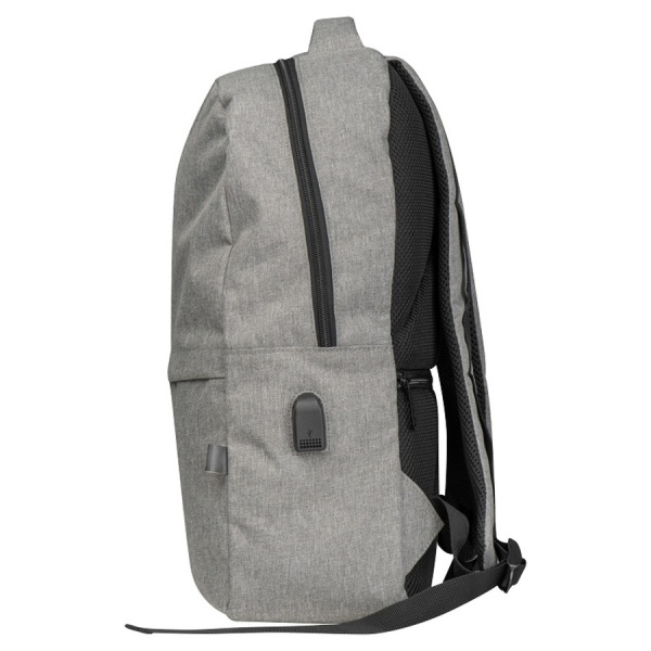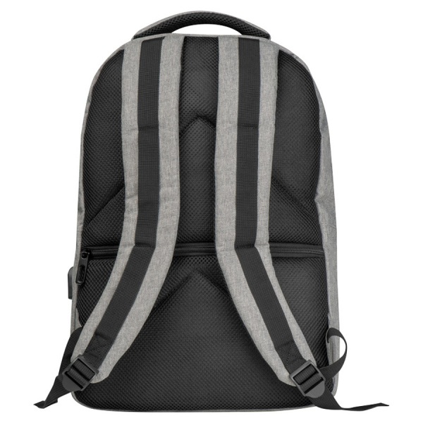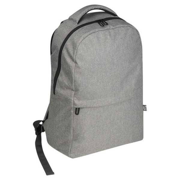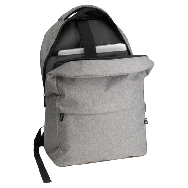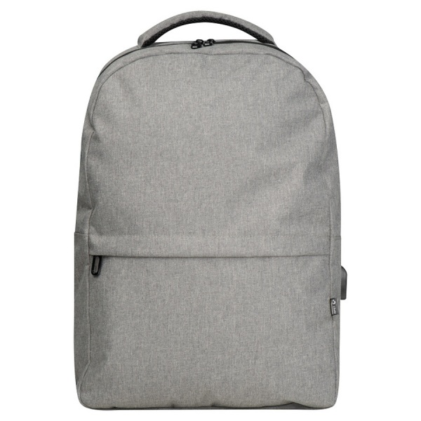 rPET batoh s USB portom, polstrovanými popruhmi, priehradkou na notebook, prednou priehradkou a priehradkou proti krádeži.