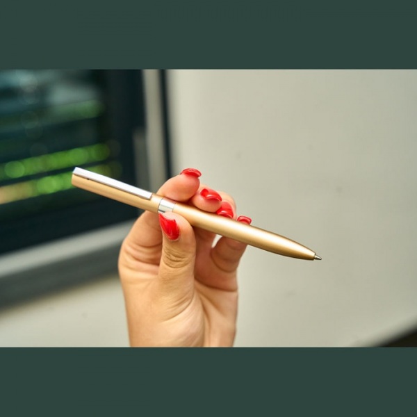 Elegantné kovové gélové pero s doplnkami v chrómových farbách. Hrúbka hrotu pera: 0,7 mm. Modrá náplň
