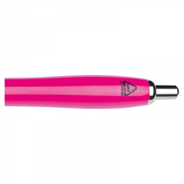 Guľôčkové pero R-ABS vyrobené z recyklovaného plastu, v rôznych farbách s doplnkami v chrómových farbách a čiernou protišmykovou časťou na uchopenie.