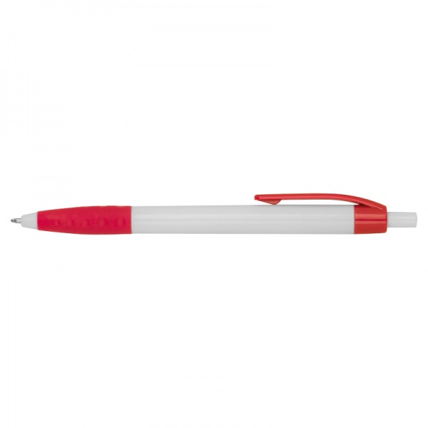 Plastové guľôčkové pero s čiernou náplňou na písanie. Biele telo, farebný klip a farebná časť na uchopenie.