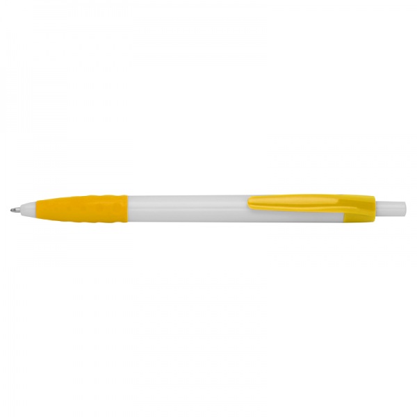 Plastové guľôčkové pero s čiernou náplňou na písanie. Biele telo, farebný klip a farebná časť na uchopenie.