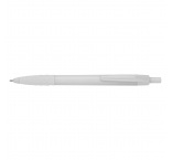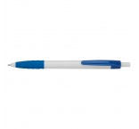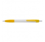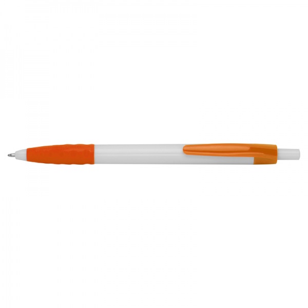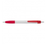 Plastové guľôčkové pero s čiernou náplňou na písanie. Biele telo, farebný klip a farebná časť na uchopenie.