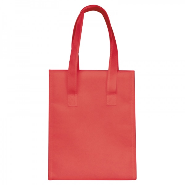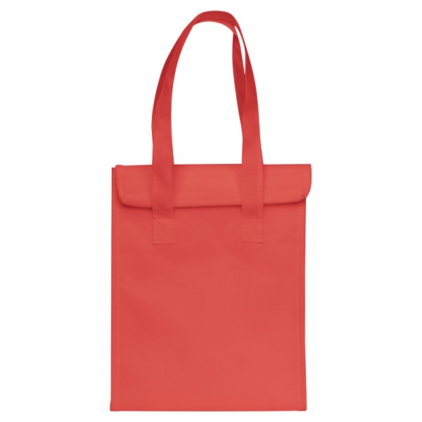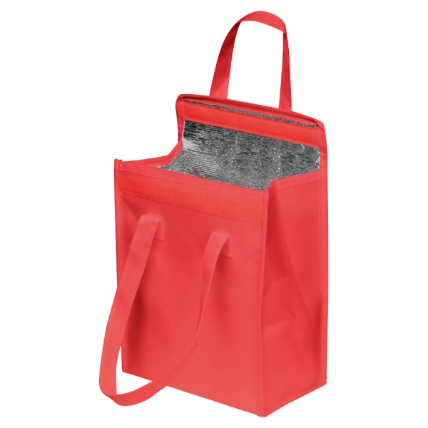 Netkaná chladiaca taška s podšívkou, s hliníkovou fóliou vo vnútri, suchým zipsom a dvoma rukoväťami.
