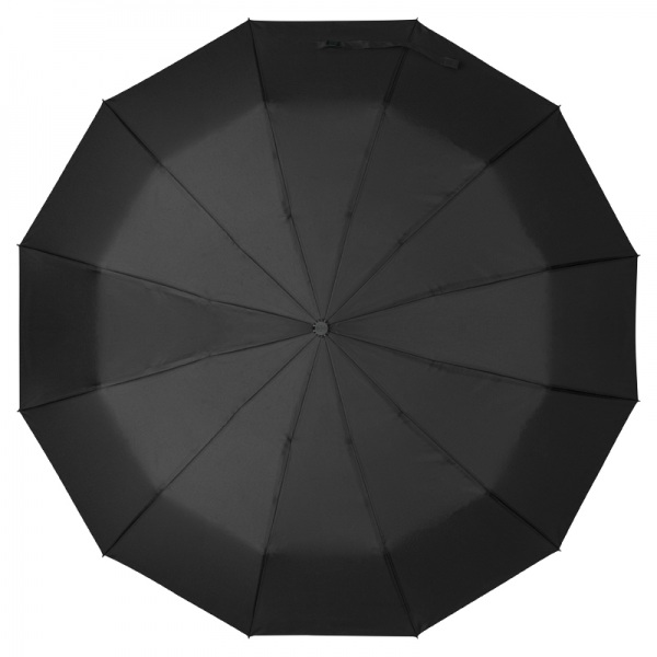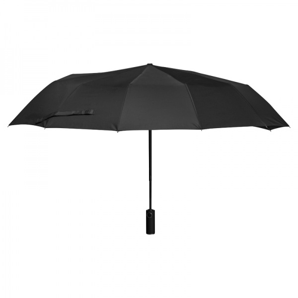 Automatický a vetruodolný dáždnik zo 190T polyesteru, s kostrou zo sklenených vlákien, s gumenou rukoväťou a remienkom na zápästie.