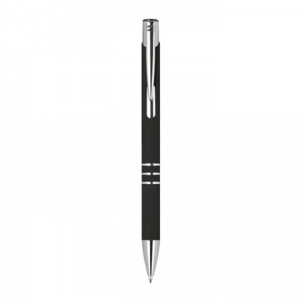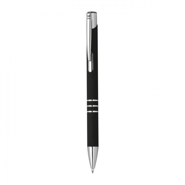 Gélové pero vyrobené z recyklovaného hliníka s pogumovaným povrchom a tromi ozdobnými krúžkami. S modro píšucou veľkokapacitnou náplňou (pologelový 0,7 mm hrot).