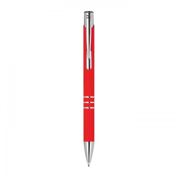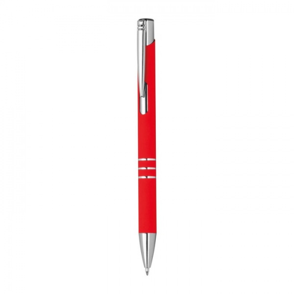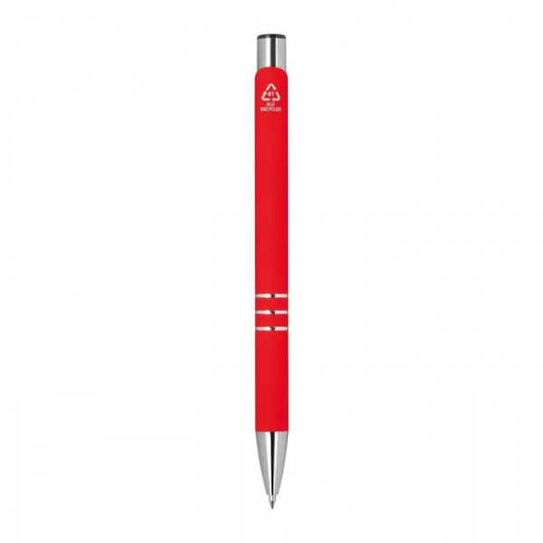 Gélové pero vyrobené z recyklovaného hliníka s pogumovaným povrchom a tromi ozdobnými krúžkami. S modro píšucou veľkokapacitnou náplňou (pologelový 0,7 mm hrot).