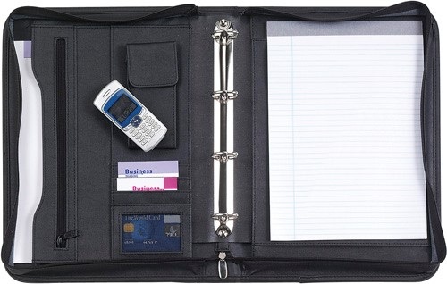 Portfólio A4 na zips s poznámkovým blokom s 30 podšitými stranami, rôznymi vreckami, držadlom na nosenie a kovovým plieškom vhodným na gravír loga.