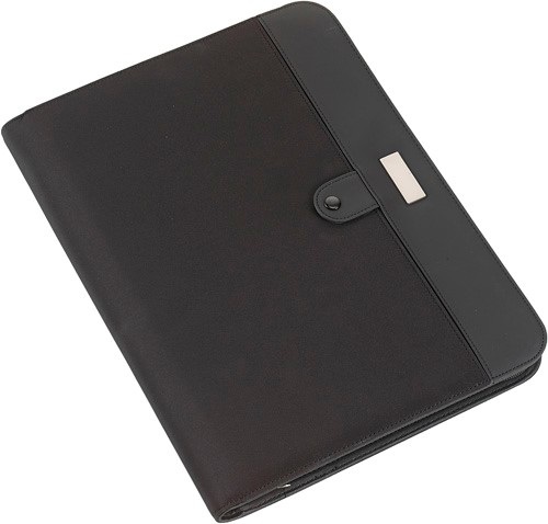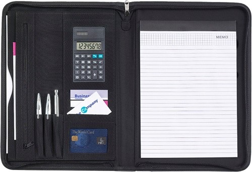 Portfólio so zipsom z mikrovlákna (približne A4) s poznámkovým blokom (20 linajkových strán). Obsahuje tiež viaceré vrecká a kalkulačku.