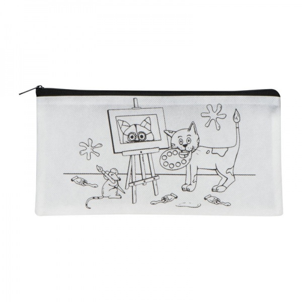 Peračník z netkanej textílie s 5 voskovými pastelkami (žltá, čierna, modrá, červená a zelená), potlačený detským motívom na vyfarbenie.
