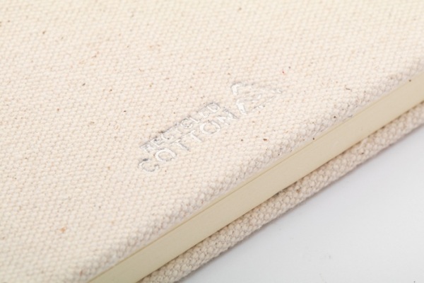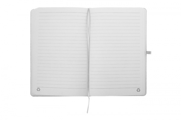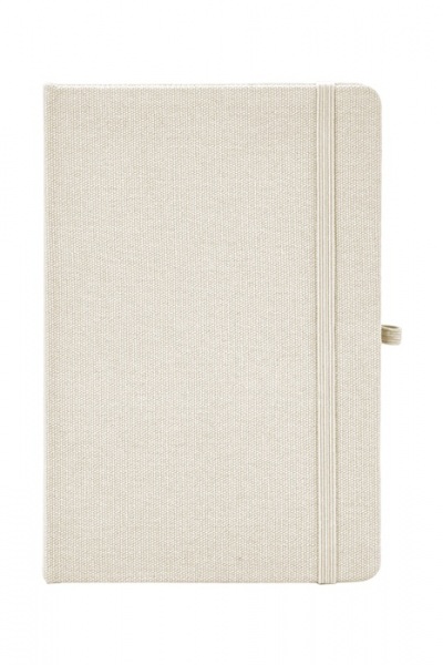 Blok potiahnutý recyklovanou bavlnou s 80 linajkovými listami z recyklovaného papiera. So záložkou v zodpovedajúcej farbe, gumičkou a držiakom na pero. Veľkosť A5.