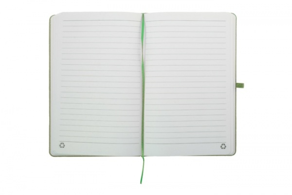 Blok potiahnutý recyklovanou bavlnou s 80 linajkovými listami z recyklovaného papiera. So záložkou v zodpovedajúcej farbe, gumičkou a držiakom na pero. Veľkosť A5.