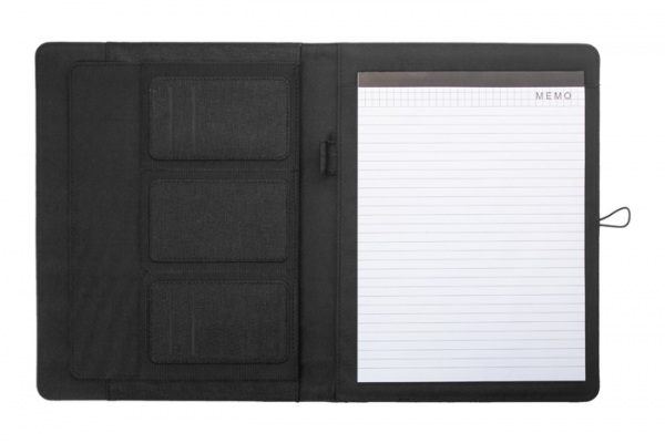 Polyesterová 300D RPET zložka na dokumenty, formát A4. Obsahuje poznámkový blok (25 linajkových listov) a organizér s viacerými vreckami.