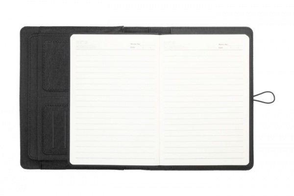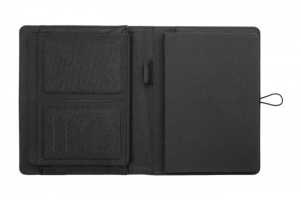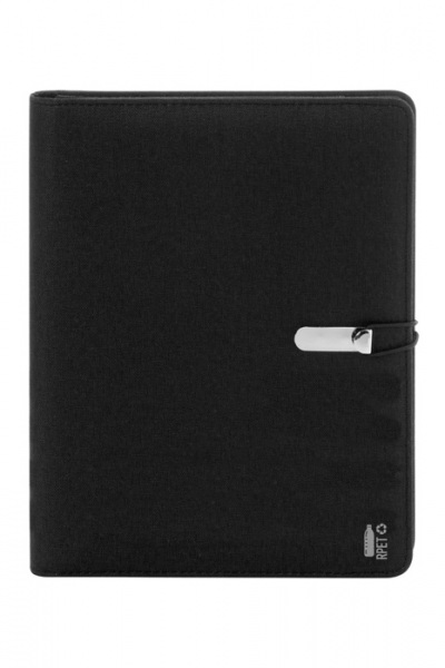 Polyesterová 300D RPET zložka na dokumenty, formát A5. Obsahuje poznámkový blok (64 linajkových listov) a organizér s viacerými vreckami.