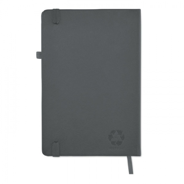 Zápisník formátu A5 s obálkou zo 70% recyklovanej predprodukčnej kože a 30% latexového PU. Recyklovaný papier, 192 linkovaných strán (96 listov). Elastická gumička a držiak na pero.