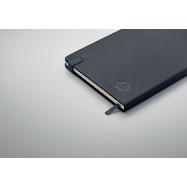 Zápisník formátu A5 s obálkou zo 70% recyklovanej predprodukčnej kože a 30% latexového PU. Recyklovaný papier, 192 linkovaných strán (96 listov). Elastická gumička a držiak na pero.