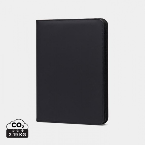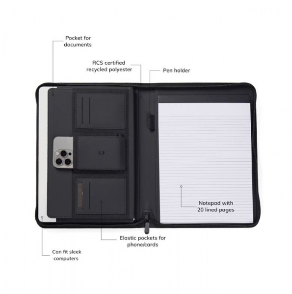 Portfólio A4 je vybavené držiakom na pero, vreckom na papier, vreckami na karty, telefón a poznámkovým blokom s 20 linkovanými stránkami. Papierová vložka je vymeniteľná. Certifikácia RCS.