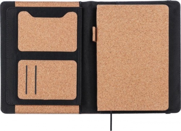 Korkové portfólio, cca. Veľkosť A5. S vnútornými vreckami, elastickým pásikom, pútkom na pero a odnímateľným zápisníkom A5 so 192 linajkovými listami recyklovaného papiera (70 g/m2). Balené v hodvábnom papieri.