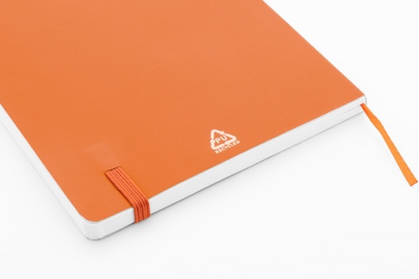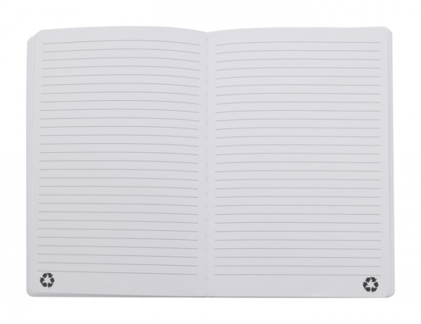 Blok A5 z recyklovanej PU kože s mäkkou väzbou s 80 linajkovými listami z recyklovaného papiera.