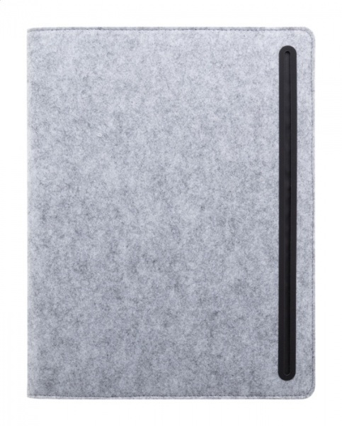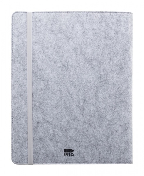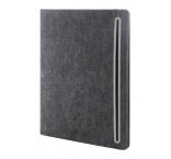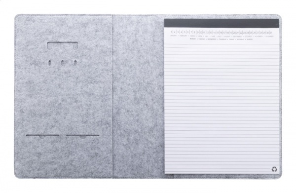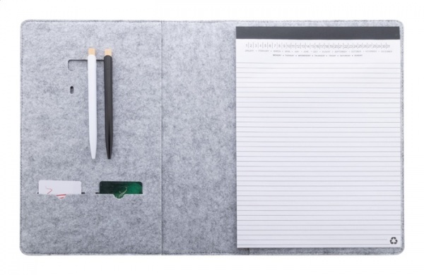 Plstená sloha A4 na dokumenty z RPET s prednými a niekoľkými vnútornými vreckami s organizérom. S 20 linajkovými listami poznámkového bloku z recyklovaného papiera.