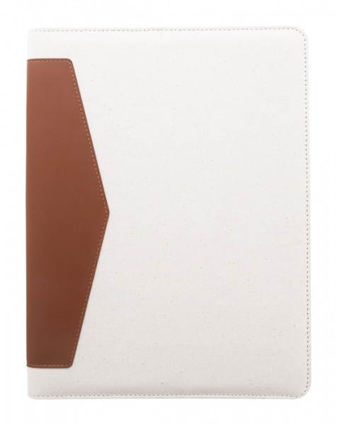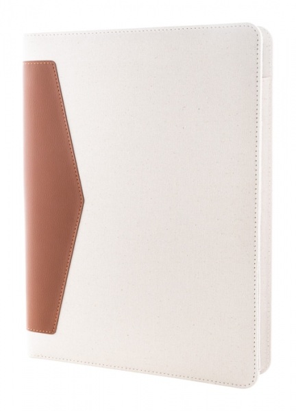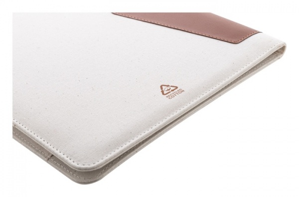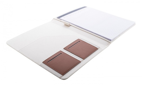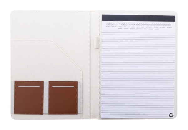 Sloha A4 na dokumenty z recyklovaného plátna a recyklovanej PU kože s niekoľkými vnútornými vreckami na organizér. S 20 linajkovými listami poznámkového bloku z recyklovaného papiera. 70% recyklovaná bavlna a 30% RPET polyester.