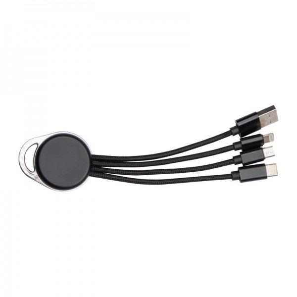 USB káblový adaptér s pripojeniami USB-A, USB-C, Micro-USB a Lightning. Náš adaptér má schopnosť osvetliť vaše individuálne logo na okrúhlom povrchu.