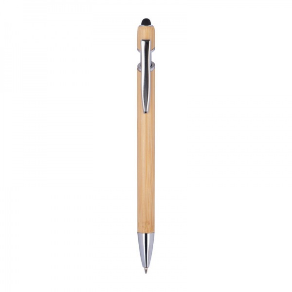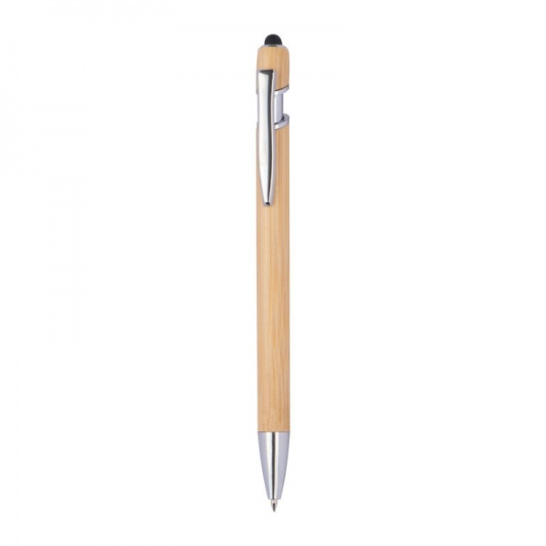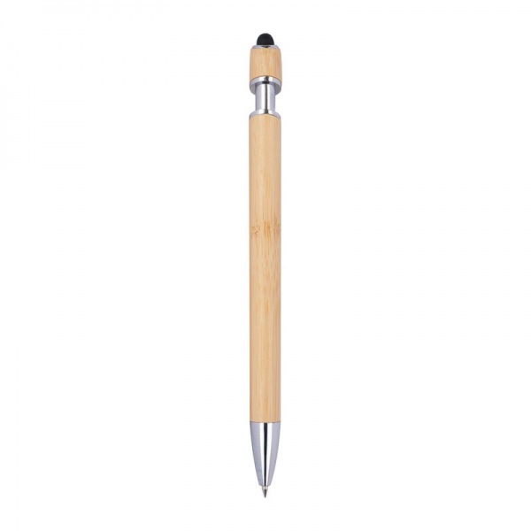Bambusové guľôčkové pero so striebornými aplikáciami, modro píšucou veľkokapacitnou náplňou a dotykovým panelom.