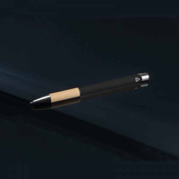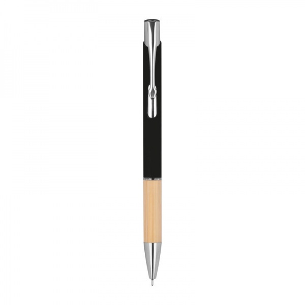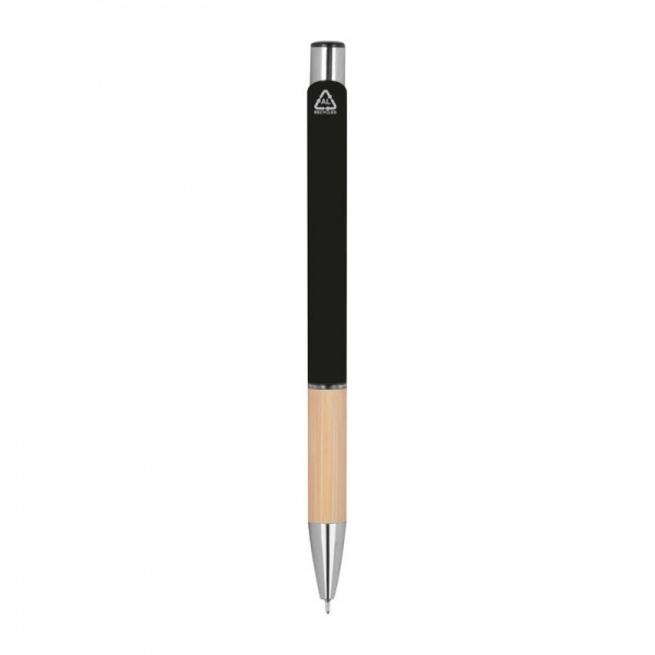 Polo-gélové pero z recyklovaného hliníka s modro píšucou náplňou. Matné strieborné aplikácie a bambusová úchopová zóna.