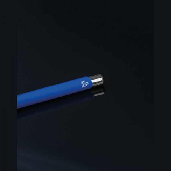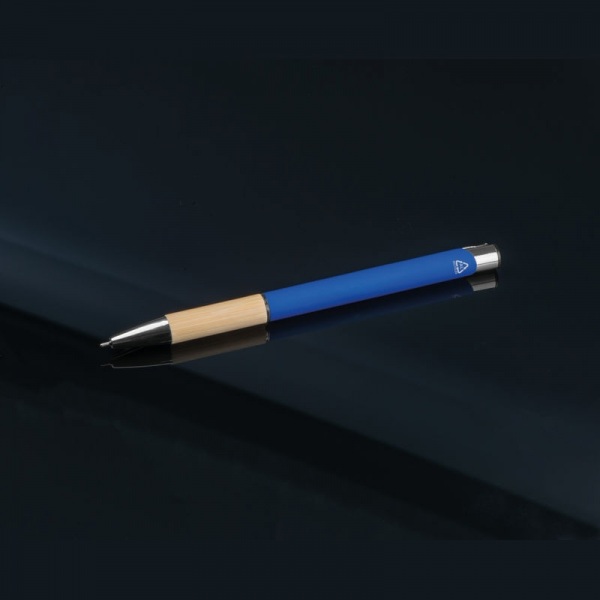 Polo-gélové pero z recyklovaného hliníka s modro píšucou náplňou. Matné strieborné aplikácie a bambusová úchopová zóna.
