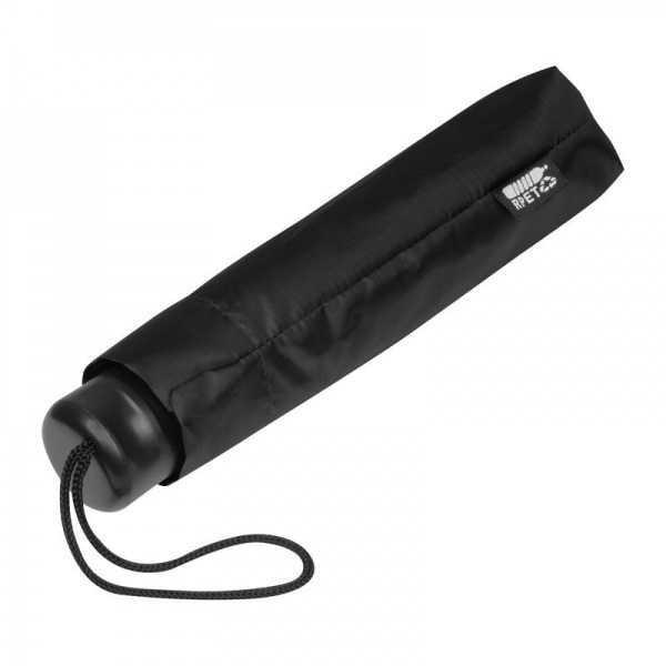 Manuálne otvárateľný teleskopický vreckový dáždnik z recyklovaného PET s ochranným obalom.