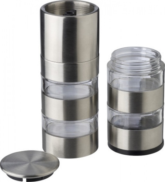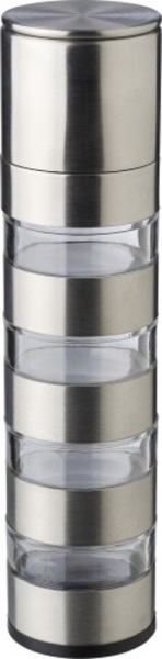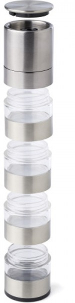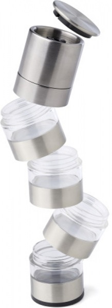 Nerezový mlynček na korenie so 4 priehradkami a keramickým mlynčekom. Jednotlivo balené v hnedej kartónovej krabici.
