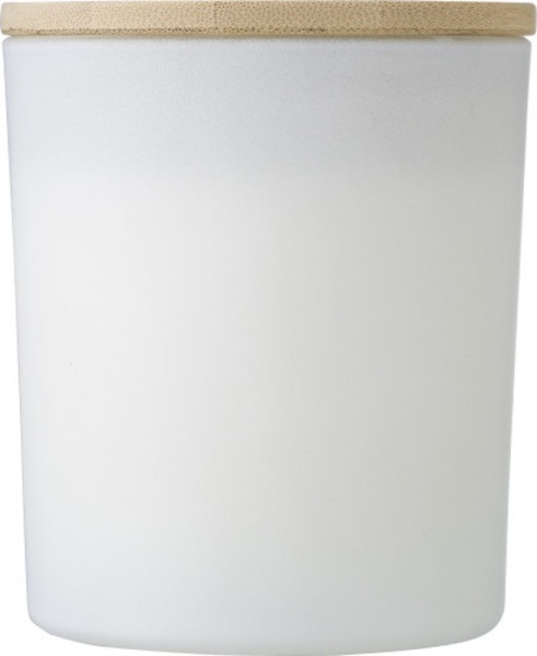 Sklenená sviečka s voskom na rastlinnej báze a bambusovým viečkom. Sviečka má dobu horenia okolo 46 hodín. 4 vône v závislosti od farby: škorica (červená), vanilka (biela), santalové drevo (čierna) a jazmín (zelená). Jednotlivo balené v bielej tube.