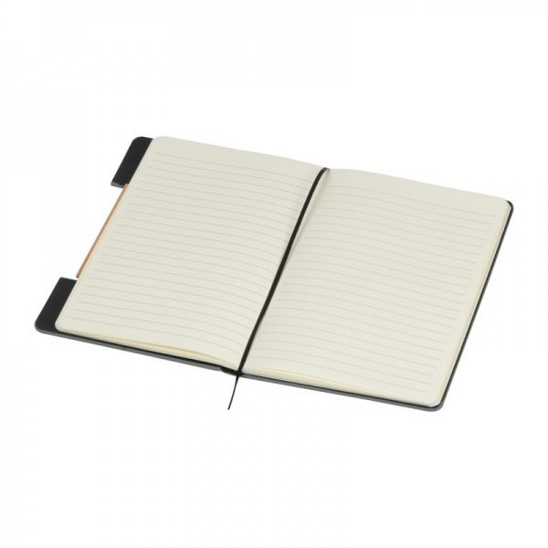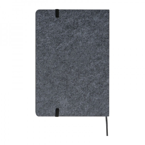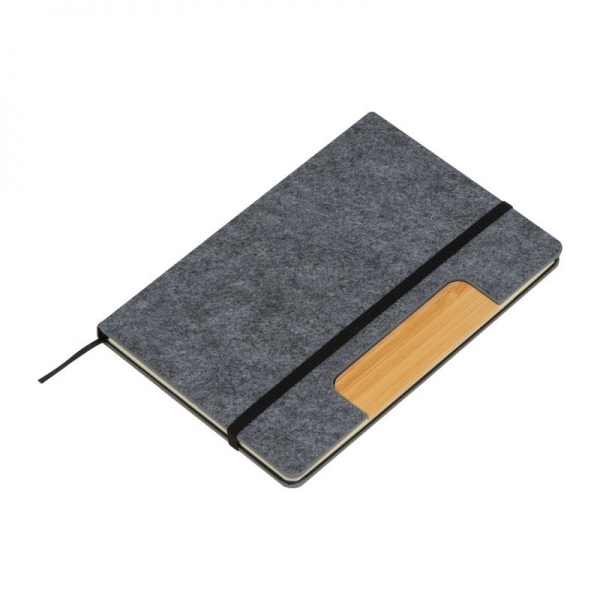 Súprava pozostávajúca zo zápisníka s plsteným/bambusovým obalom a bambusového guľôčkového pera, v čiernej darčekovej krabičke. Obsahuje 80 strán linkovaného recyklovaného papiera (70 g/m?), guľôčkové pero má modrú náplň a náhradnú náplň.