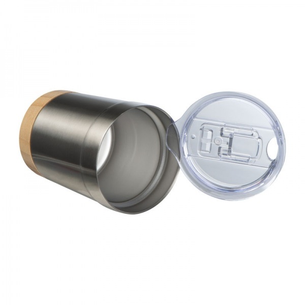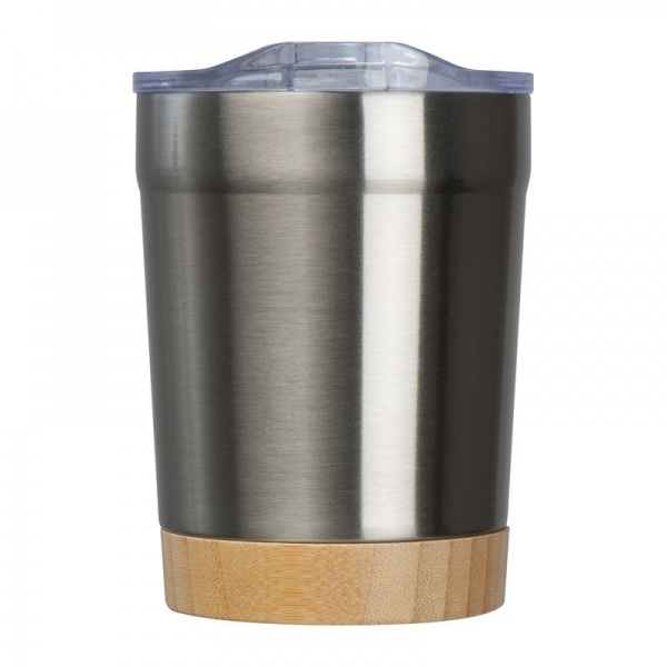 Recyklovaný nerezový hrnček s bambusovým dnom, objemom 300 ml a priehľadným pitným vekom.