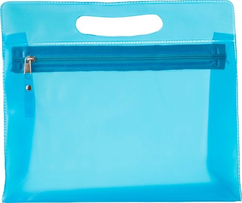 Toaletná taška z matného PVC s integrovanou rukoväťou a zipsom.